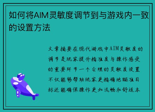 文章摘要:在现代游戏中,AIM灵敏度的调节是玩家提升精准度与操作感受的重要环节。一个合理的灵敏度设置不仅能够帮助玩家更精确地瞄准目标,还能确保操作更加流畅和舒适。本文将围绕如何将AIM灵敏度调节到与游戏内一致的设置方法展开,重点介绍四个关键因素:硬件配置、游戏内设置、操作习惯与测试调整。每个因素都会...
